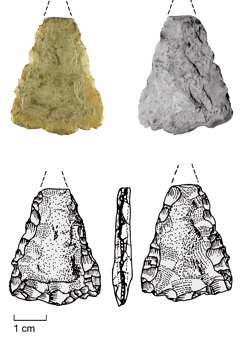 Fotografie und Zeichnung einer jungneolithischen Pfeilspitze, ca. 6.500 Jahre